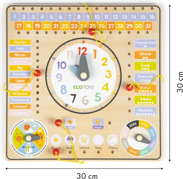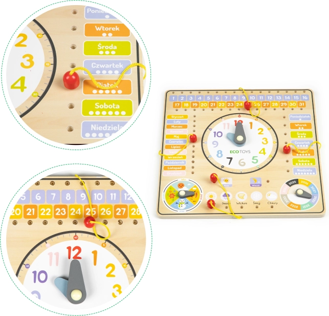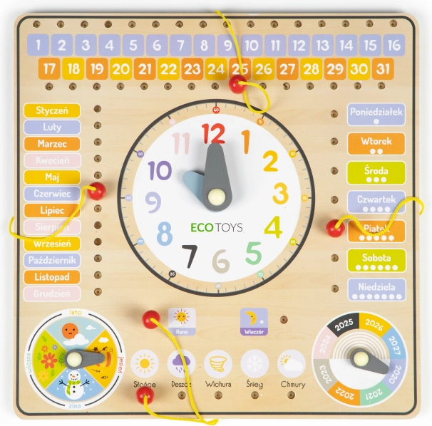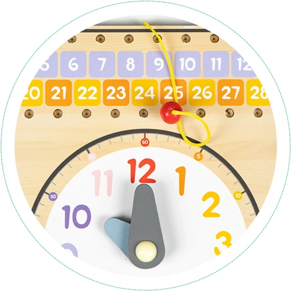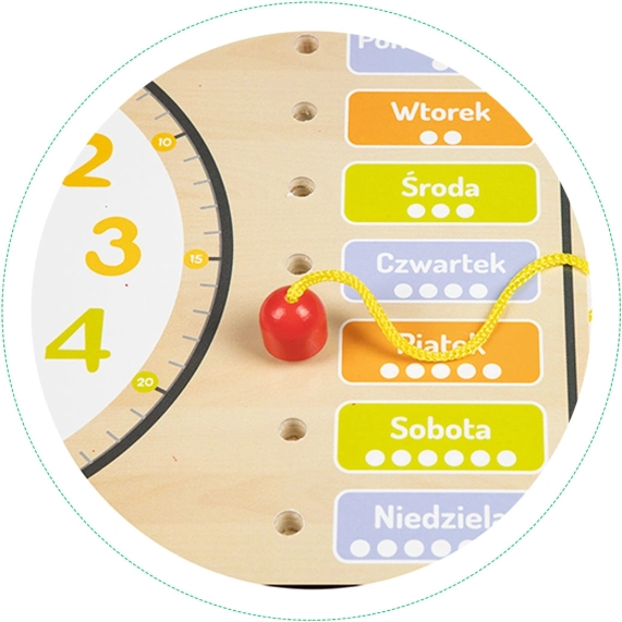 Pozwól swoim dzieciom odkrywać świat z tą kolorową i bezpieczną drewnianą tablicą. Uczy rozpoznawania dni tygodnia, ich kolejności oraz miesięcznych okresów. Dzięki specjalnym polom dzieci mogą zaznaczać dni w kalendarzu za pomocą sznureczka i drewnianej klamerki.
