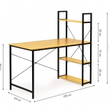 Biurko oferuje przestronną powierzchnię roboczą oraz boczny stojak z czterema półkami do przechowywania książek, dokumentów lub dekoracji. Cała konstrukcja została zaprojektowana z myślą o trwałości i długiej żywotności, dzięki zastosowaniu materiałów takich jak płyta MDF i stal malowana proszkowo.