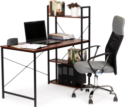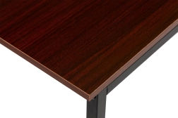 To drewniane biurko komputerowe wykonano z wysokiej jakości materiałów, łączących drewno i metal dla maksymalnej wytrzymałości i trwałości. Powierzchnia biurka jest pokryta ciemnobrązowym laminatem, co zapewnia elegancki wygląd i łatwą pielęgnację.