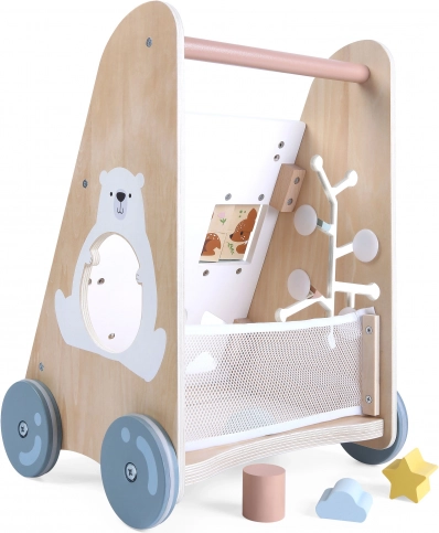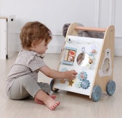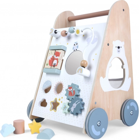 Drewniany chodzik dla dzieci od 18 miesięcy oferuje nie tylko pomoc w nauce chodzenia, ale także mnóstwo zabawy i rozwój umiejętności manualnych. Panel edukacyjny zawiera: