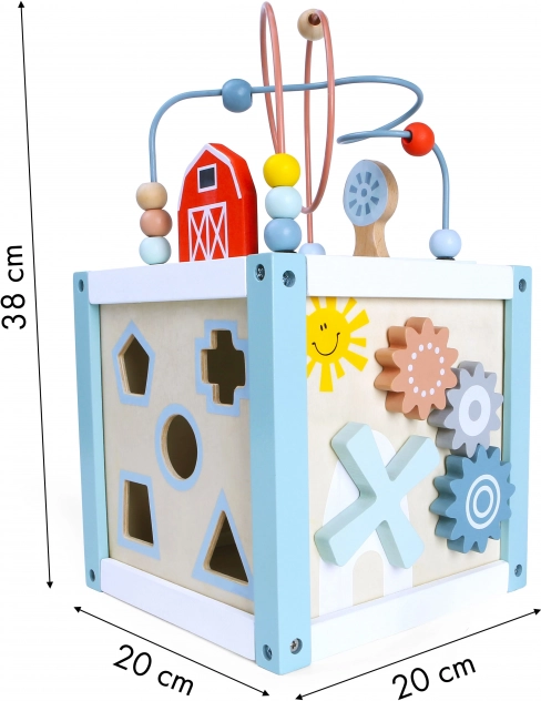 Kostka jest wyposażona w labirynt z koralikami, lustro i obracające się koła zębate, które rozwijają dziecięcą sprawność manualną.