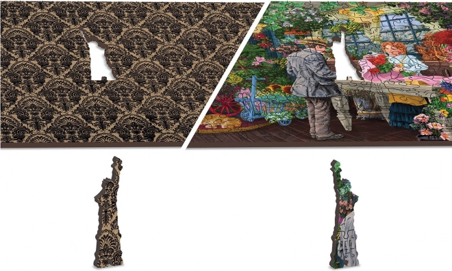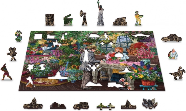 Stylowe drewniane puzzle z motywem tętniącej życiem kwiaciarni ucieszą miłośników dopracowanych ilustracji i bardziej wymagających układanek. Dzięki dwustronnemu wykonaniu zyskujesz dwie układanki w jednej – awers z kolorową sceną pełną kwiatów oraz rewers ze wzorem do układania według kształtów. Unikalne wykroje w kształcie zwierząt, postaci i przedmiotów działają jak małe figurki i nadają układaniu nowy wymiar.