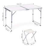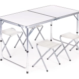 Lekki składany stół i cztery wytrzymałe stołki z stalową konstrukcją. Idealny na biwak, pikniki, festiwale i do ogrodu.