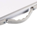 Cały zestaw składa się do praktycznej walizki, do której mieszczą się także stołki. Dzięki temu zajmuje minimum miejsca w aucie i w domu. Lekka konstrukcja z wygodnym uchem ułatwia przenoszenie na kemping, plażę i do ogrodu.