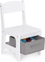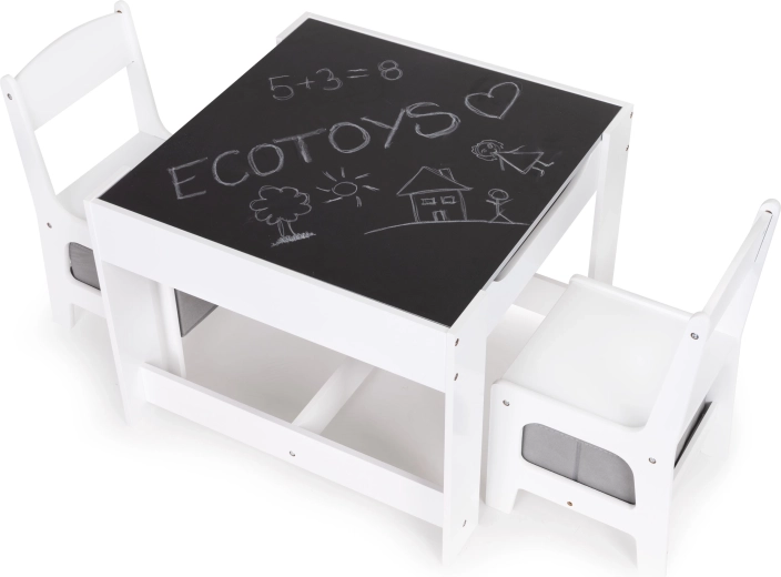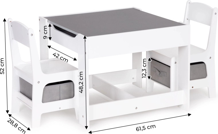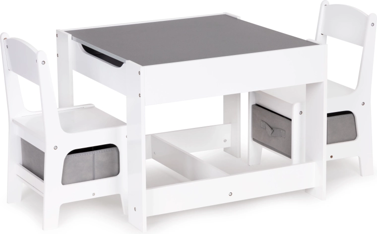Piękny zestaw dla wszystkich dzieci, który dzięki prostej formie doskonale wpasuje się w wystrój pokojów dziecięcych, sal zabaw lub poczekalni. Zestaw wykonany jest z płyty MDF, dzięki czemu jest odporny na uszkodzenia/zarysowania. Do kompletu dołączono dwa stabilne i wygodne krzesełka z funkcjonalnymi koszykami pod siedziskiem, idealnymi do przechowywania zabawek.