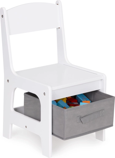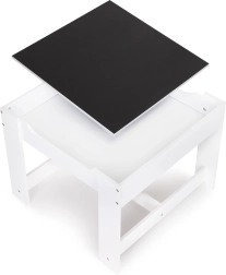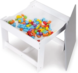 Pod blatem znajduje się ukryta przestrzeń, która pomoże utrzymać porządek i wyrabiać nawyk sprzątania po zabawie. Schowek pomieści klocki, mniejsze zabawki i inne drobiazgi, które warto mieć pod ręką.