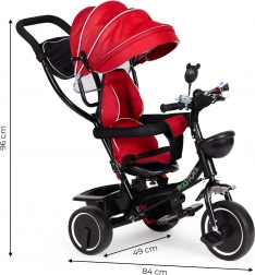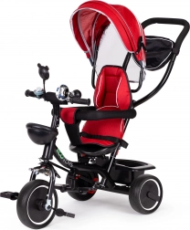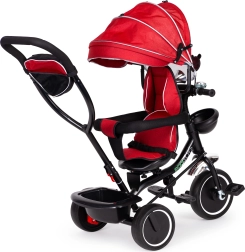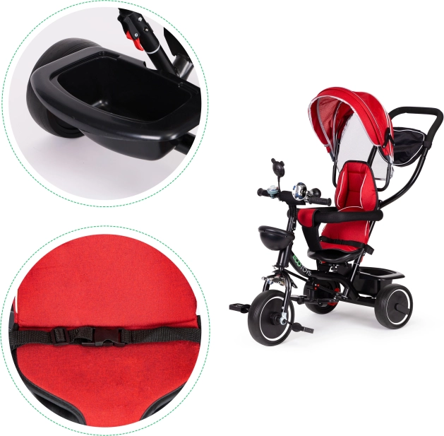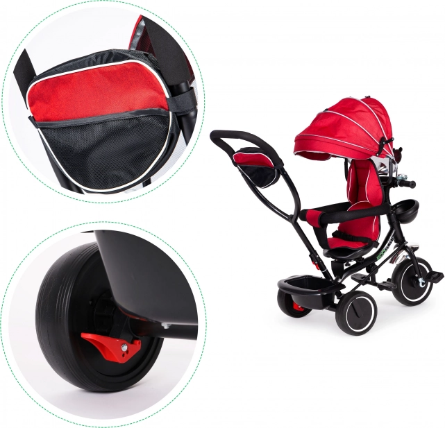Trójkołowiec jest wyposażony w miękkie oparcie, bezpieczne pasy oraz składany daszek chroniący przed słońcem i deszczem. Jest specjalnie zaprojektowany dla małych dzieci, aby łatwiej mogły usiąść na siedzeniu.