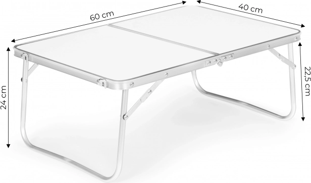 Blat 60 × 40 cm i wysokość 24 cm są idealne do niskiego siedzenia. Po złożeniu do 40 × 30 cm zajmuje minimum miejsca.