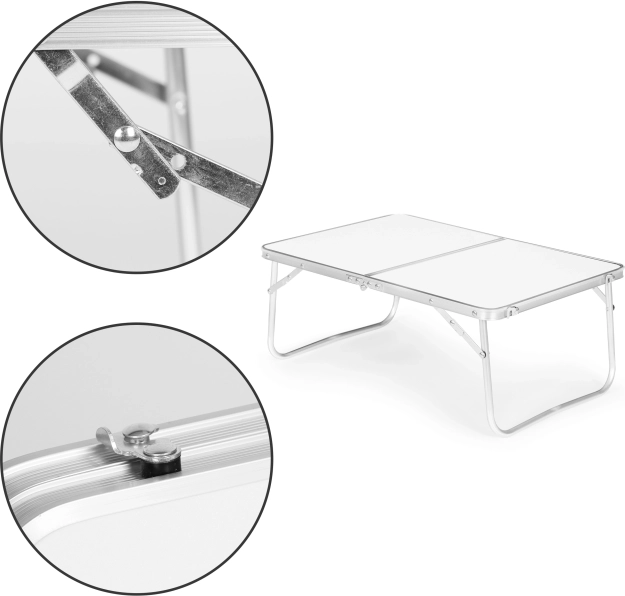 Praktyczny składany stół kempingowy 60 × 40 cm w kolorze białym od MULTIGARDEN jest idealny na biwak, piknik i wycieczki. Oferuje lekką i solidną konstrukcję, zabezpieczenie przed samoczynnym złożeniem, szybkie składanie/rozkładanie oraz wygodny uchwyt do przenoszenia. Po złożeniu zmienia się w kufer, waży tylko 1 kg i udźwignie do 20 kg.