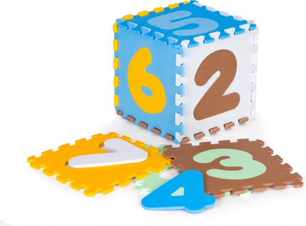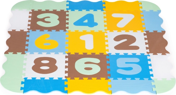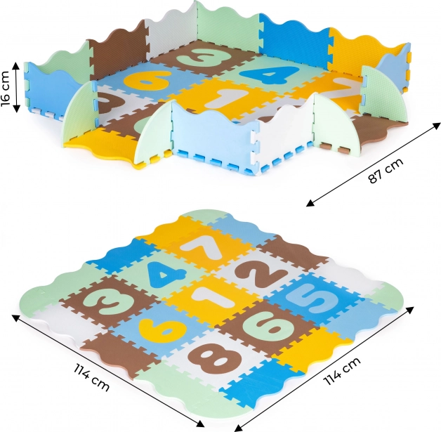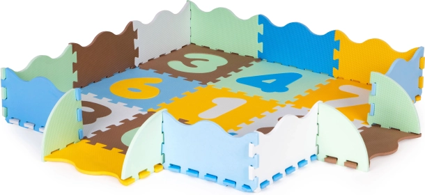 Elementy składają się jak puzzle i pozwalają tworzyć różne kształty oraz praktyczny kojec, który zapobiega turlaniu się zabawek poza wyznaczony obszar. Wyjmowane cyfry wspierają wizualną naukę, rozwój małej motoryki i wyobraźni – z elementów można budować proste konstrukcje 3D, takie jak kostki czy wieże.
