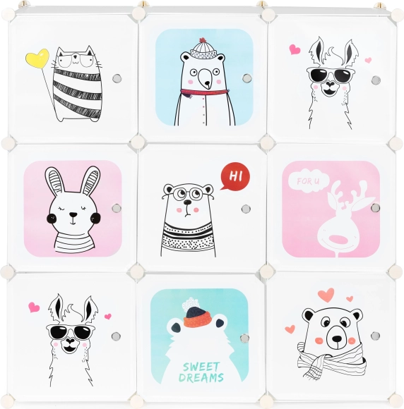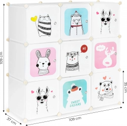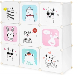 Ta dziecięca modułowa szafka wprowadzi do pokoju porządek i radosny wygląd. Dziewięć oddzielnych kubików z łatwo otwieranymi drzwiczkami pomieści zabawki, książki i ubrania, a kolorowe ilustracje zwierzątek ocieplą przestrzeń i pobudzą dziecięcą wyobraźnię. Lekka konstrukcja jest bezpieczna dla dzieci i pozwala im samodzielnie dbać o porządek.
