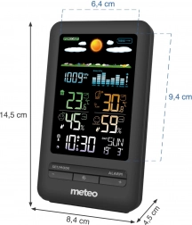 Inteligentna stacja meteorologiczna METEO SP103 z bezprzewodowym sensorem mierzy temperaturę wewnętrzną i zewnętrzną oraz wilgotność, posiada barometr z wykresem zmian ciśnienia, prognozę pogody za pomocą piktogramów, wskazanie komfortu oraz dokładny sygnał czasu DCF. Zasięg sensora do 60 m, alarm z funkcją snooze i możliwość zasilania z sieci.