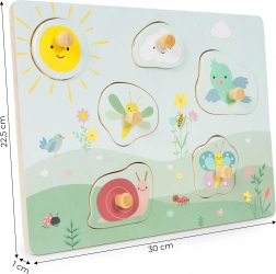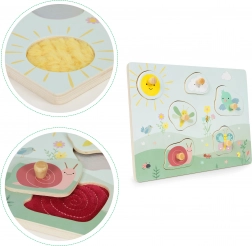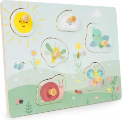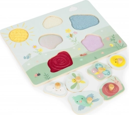Kolorowe elementy z naturalnymi motywami zachęcają dzieci do dopasowywania do odpowiednich okienek. Ćwiczą rozpoznawanie kształtów i kolorów, a jednocześnie rozwijają małą motorykę dzięki wygodnym drewnianym uchwytom.
