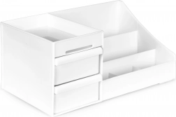 Uniwersalny organizer ModernHome to idealny wybór do codziennego, przejrzystego przechowywania. Dzięki przemyślanemu podziałowi oferuje przegródki o różnych rozmiarach na pomadki, lakiery do paznokci, pędzle, biżuterię oraz drobiazgi biurowe. Dwie praktyczne szufladki bezpiecznie ukryją mniejsze przedmioty, które chcesz mieć pod ręką, ale bez bałaganu.