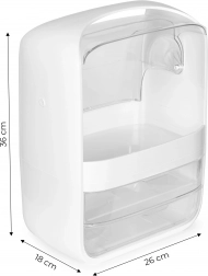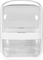 Organizer wykonano z wytrzymałego, łatwego do mycia tworzywa, odpowiedniego do łazienki i na toaletkę. Przezroczysty front szuflad oraz pokrywka pozwalają szybko znaleźć to, czego potrzebujesz, bez żmudnego przeszukiwania. Dzięki kompaktowym wymiarom bez trudu zmieści się na półce, komodzie lub obok umywalki.