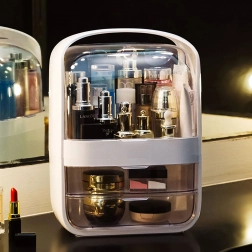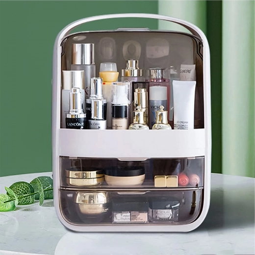 Ten kosmetyczny box w eleganckim białym kolorze pomoże mieć codzienną pielęgnację zawsze pod ręką. Górna komora z przezroczystą, uchylną pokrywką wygodnie pomieści buteleczki kremów, sera, perfumy i wyższe opakowania, natomiast dwie przestronne szuflady utrzymają drobiazgi, takie jak palety, pomadki czy pędzle, w porządku i z dala od kurzu.
