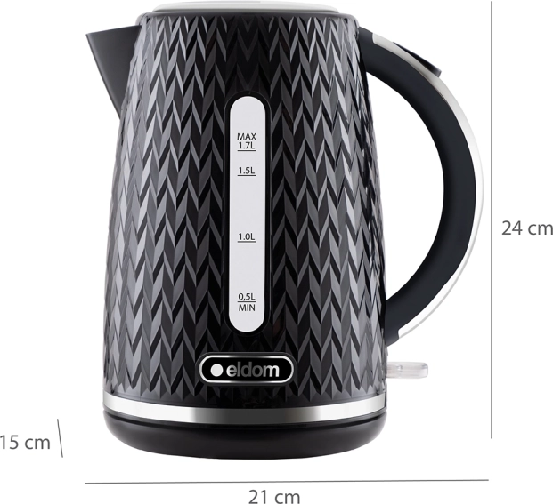 Stylowy czajnik elektryczny ELDOM C260 Nelo o pojemności 1,7 l i mocy 2000 W niezawodnie zagotuje wodę dla całej rodziny. Oferuje bezprzewodową konstrukcję z obrotową podstawą 360°, czytelny wskaznik poziomu wody, automatyczne wyłączanie oraz potrójny system bezpieczeństwa. Wysokiej jakości komponenty OTTER, wygodny przycisk otwierania pokrywy i nowoczesny fakturowany design świetnie pasują do każdej kuchni.