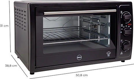 W środku znajdziesz oświetloną komorę pieczenia z wytrzymałą, podwójną hartowaną szybą dla lepszej izolacji. Obsługa jest prosta za pomocą pokręteł: ustawiasz funkcję, temperaturę i czas. Po upływie czasu sygnał dźwiękowy poinformuje Cię o zakończeniu, a piekarnik automatycznie się wyłączy.