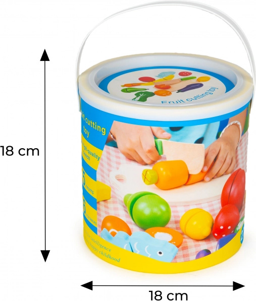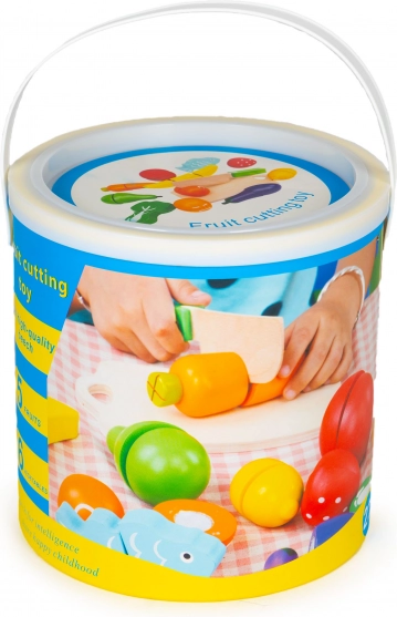 Zabawny zestaw dla małych kucharzy: drewniane owoce i warzywa, które można kroić i ponownie łączyć na rzep. W zestawie znajduje się bezpieczny nóż oraz deska do krojenia dla realistycznej zabawy. Praktyczne wiaderko z pokrywką ułatwia przechowywanie i przenoszenie. Świetne do rozwoju motoryki małej i koordynacji, idealne od 3 lat.