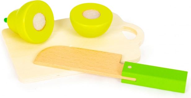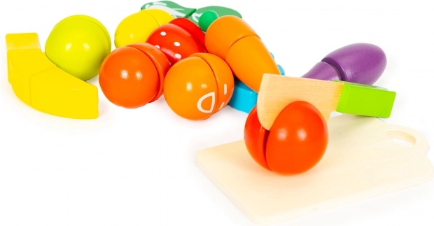 Bezpieczny drewniany nóż i elementy dzielone na połówki wspierają motorykę małą, prawidłowy chwyt oraz koordynację oko–ręka. Idealne dla dzieci od 3 lat.