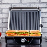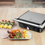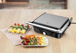 Przygotowuj soczyste steki w trybie grilla kontaktowego lub otwórz płyty do 180°, aby uzyskać dużą, płaską powierzchnię do grillowania warzyw, ryb czy szaszłyków.