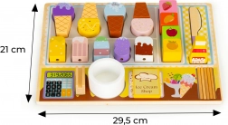 Ten drewniany zestaw lodziarni zaprasza dzieci do świata zabaw w odgrywanie ról – mogą stać się sprzedawcą, klientem lub małym cukiernikiem. Precyzyjnie wykonane elementy z realistycznymi detalami dodają zabawie autentyczności i rozwijają małą motorykę, współpracę oraz komunikację.