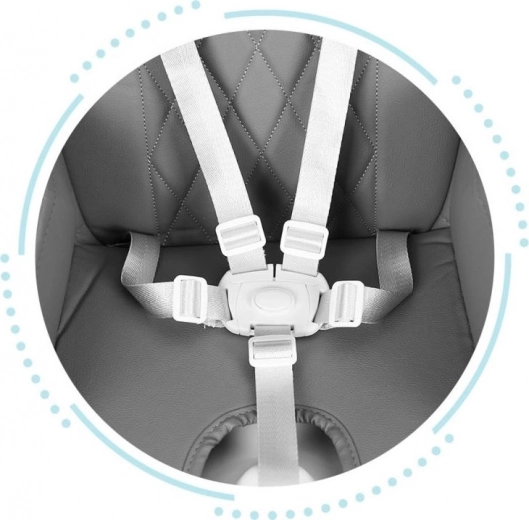 Siedzisko wyposażono w 5‑punktowe pasy bezpieczeństwa, dzięki którym Twoje dziecko będzie prawidłowo zabezpieczone, a pasy utrzymają je w prawidłowej pozycji.