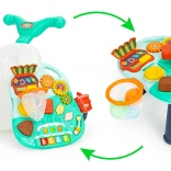Wystarczy odłączyć panel z przodu pchacza, zamontować nogi i można korzystać z funkcjonalnego stolika z licznymi ruchomymi elementami. Ciekawym dodatkiem jest małe pianinko odtwarzające dźwięki i melodie, które z pewnością szybko stanie się ulubionym elementem zabawki, zapewniając każdemu dziecku świetną zabawę.