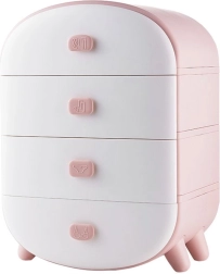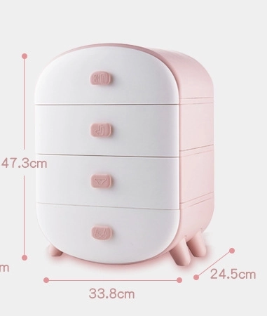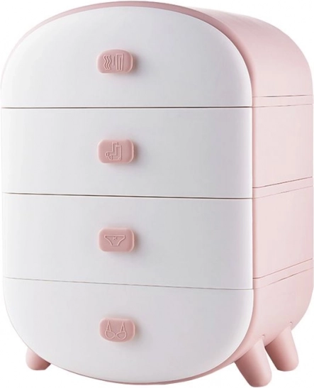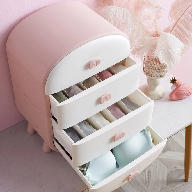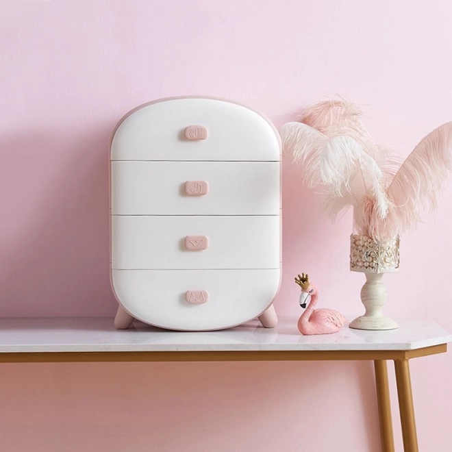 Zaokrąglone krawędzie, nowoczesny design i delikatny różowo-biały kolor świetnie wkomponują się we wnętrze. Komoda jest lekka, stabilna i łatwa w utrzymaniu – wystarczy przetrzeć wilgotną ściereczką. Może posłużyć również jako oryginalna szafka nocna lub pomocnik na toaletce.