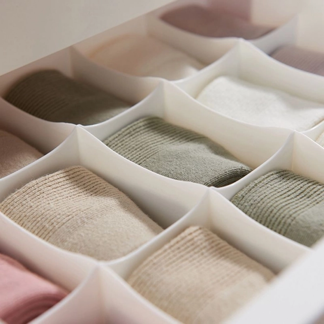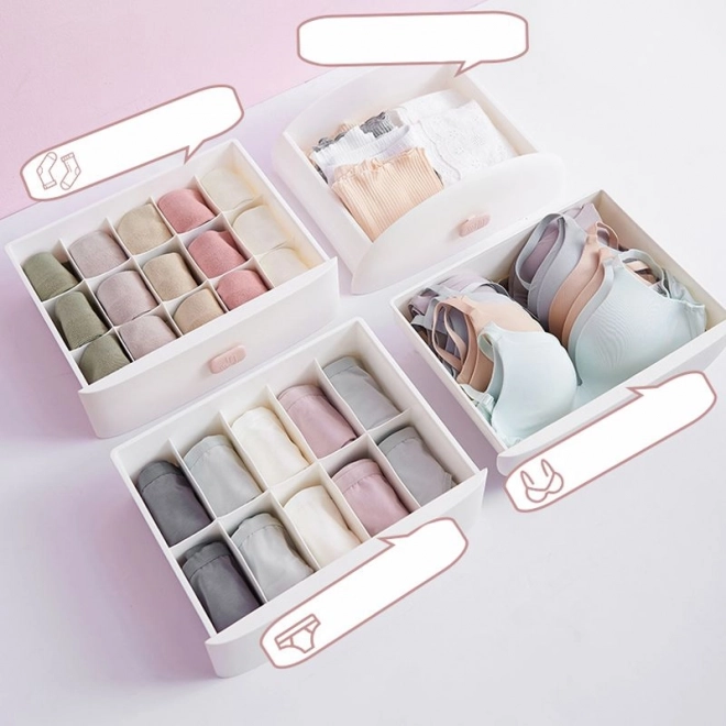 Ta kompaktowa komoda jest idealna do organizacji bielizny, dodatków i drobiazgów w sypialni, garderobie, a także w pokoju dziecięcym. Cztery przemyślane szuflady z różnym wewnętrznym podziałem utrzymają wszystko na swoim miejscu – od biustonoszy po skarpetki. Dzięki czytelnym ikonom na uchwytach zawsze wiesz, co znajduje się w danej szufladzie.