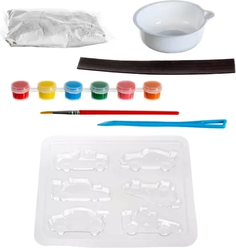 - Kompletne wyposażenie: forma na 6 motywów, gips, farby, pędzelek, miseczka i szpatułka.