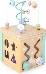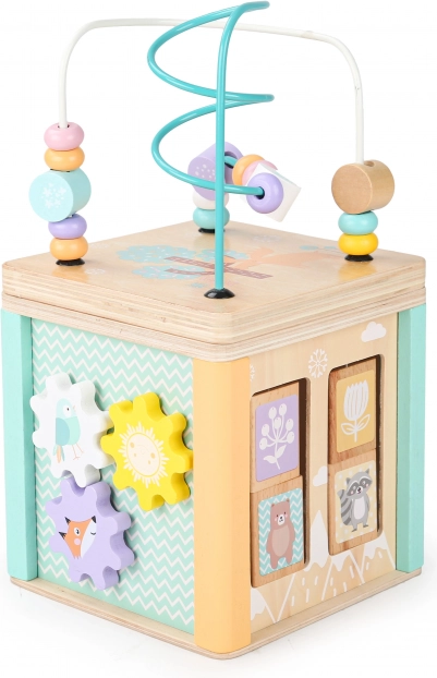 Każda ścianka kostki oferuje różne elementy zabawowe, takie jak labirynt, przesuwane puzzle czy obrotowe zębate kółka, które wspierają umiejętności motoryczne i poznawcze dziecka.