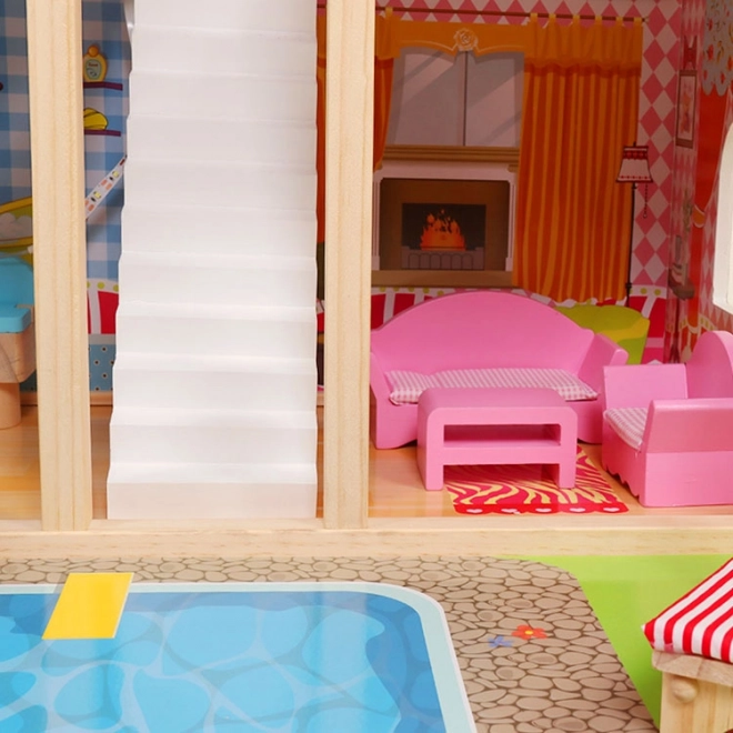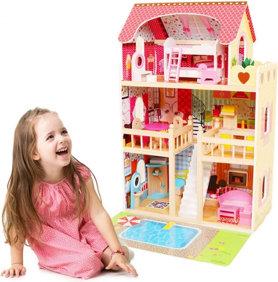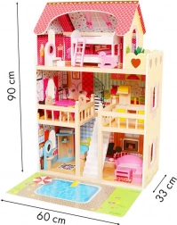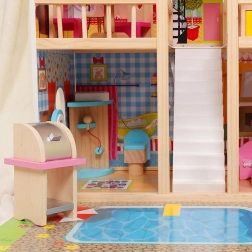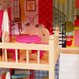 Odczaruj pokój dziecka w świat pełen wyobraźni. Ten przestronny drewniany domek ma 3 niezależne poziomy i 6 różnych pomieszczeń w przyjemnych kolorach, które zachęcają do długiej zabawy lalkami. Pasek LED pięknie oświetla wnętrze i dodaje zabawie magicznego klimatu także wieczorem.