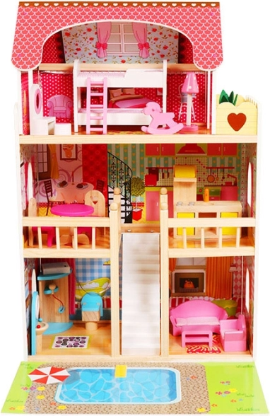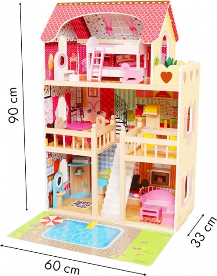 Duży drewniany domek dla lalek ECOTOYS oferuje 3 piętra i 6 pomieszczeń, oświetlenie LED dla magicznej atmosfery oraz 16 elementów drewnianych mebli. Stabilna i bezpieczna konstrukcja jest idealna dla dzieci od 3 lat, wspiera wyobraźnię, kreatywność i motorykę małą. W zestawie znajduje się także mata do zabawy z motywem basenu dla jeszcze ciekawszej zabawy.