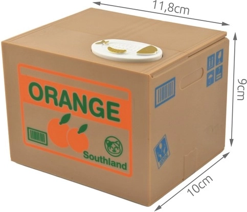 Zamień oszczędzanie w zabawę! Interaktywna skarbonka w stylu „pudełka z pomarańczami” skrywa milutkiego kotka, który po położeniu monety na talerzyku wyjeżdża, zabiera monetę łapką i z radosnym miauknięciem chowa ją do środka. Dzieci dostają natychmiastową nagrodę i motywację, by odkładać drobne.