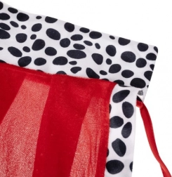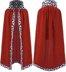 Czerwony płaszcz z czarno-białym „dalmatyńskim” lamowaniem prezentuje się majestatycznie, jest miękki w dotyku i dzięki wiązaniu dobrze trzyma się na ramionach.