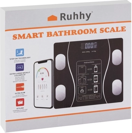 Zachowaj kontrolę nad swoją kondycją dzięki inteligentnej wadze RUHHY. Dzięki czterem precyzyjnym czujnikom i łączności Bluetooth uzyskasz szczegółową analizę ciała bezpośrednio w telefonie. Szklana platforma z hartowanego szkła w eleganckiej czerni doskonale pasuje do każdej łazienki i zapewnia bezpieczny, stabilny pomiar do 180 kg.