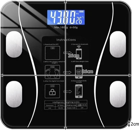 Inteligentna waga łazienkowa RUHHY z precyzyjnym wyświetlaczem LCD i łącznością Bluetooth mierzy aż 8 parametrów ciała, w tym masę ciała, BMI, tłuszcz, mięśnie, wodę i masę kostną. Eleganckie czarne szkło hartowane wytrzymuje do 180 kg, a na ekranie zobaczysz także temperaturę w pomieszczeniu i poziom baterii. Dane synchronizują się z bezpłatną aplikacją OKOK International, co umożliwia przejrzyste monitorowanie postępów.