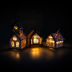 Urocza drewniana dekoracja w formie małego domeczku o wymiarach 5 × 5 × 5 cm zachwyca baśniowym wyglądem i czarodziejskimi falami na dachach. W zestawie znajduje się świeczka LED z wymienną baterią 3V, która tworzy przytulne światło. Domeczek jest od razu gotowy do użycia – możesz go zawiesić dzięki jutowemu sznurkowi lub postawić na półce czy stole.