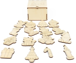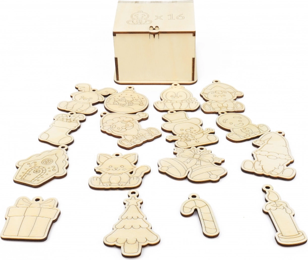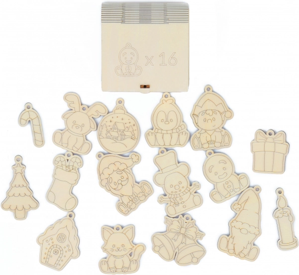 Urocze drewniane magnesy ze świątecznymi motywami rozświetlą każdą lodówkę i pokój dziecięcy. Zestaw 16 sztuk można łatwo przymocować dzięki magnesowi, są bezpieczne, lekkie i do pokolorowania kredkami woskowymi lub flamastrami. Każdy magnes ma oczko do zawieszenia na choince lub jako dekoracja we wnętrzu. Dostarczane w oryginalnym drewnianym pudełku – świetny świąteczny prezent dla dzieci i dorosłych.