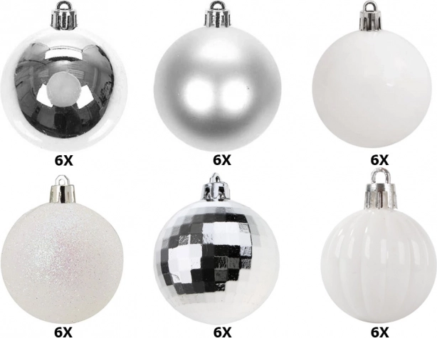 Zestaw zawiera różnorodne style, obejmując wszystko od eleganckiej bieli po błyszczące srebrne kule disco.
