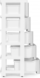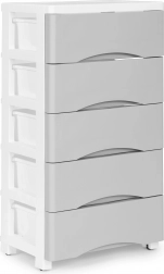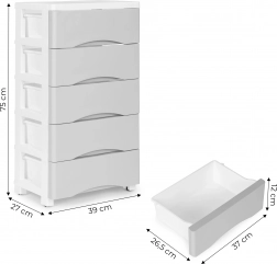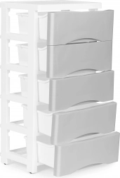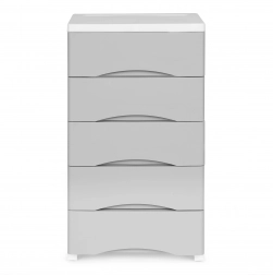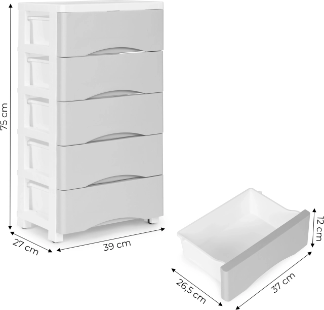 Ta mobilna komoda z szufladami w uniwersalnym połączeniu bieli i szarości wprowadzi porządek do codziennego życia. Świetnie sprawdzi się w łazience na kosmetyki i chemię, w pokoju dziecięcym na zabawki i klocki lub w gabinecie na artykuły biurowe. Pięć głębokich szuflad zapewnia dużo miejsca, a ergonomiczne uchwyty frontowe gwarantują wygodne wysuwanie.