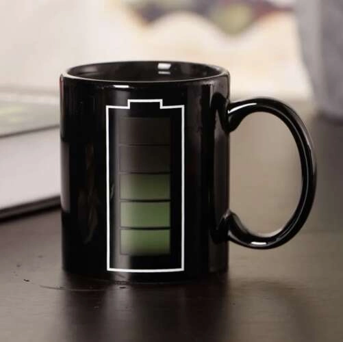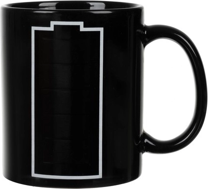 Potrzebujesz doładować energię? Ten magiczny kubek pokaże to dosłownie. Po nalaniu gorącego napoju biały zarys ikony baterii stopniowo wypełnia się zielonym kolorem – jakby bateria się ładowała. Gdy napój stygnie, kolor znika, więc zawsze wiesz, kiedy czas na kolejny łyk.