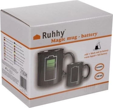 Stylowy czarny ceramiczny kubek z termoczułym nadrukiem baterii, który po zalaniu gorącym napojem „ładuje się” na zielono. Magiczny efekt na oczach pokazuje, jak gorący jest napój, dodając każdej kawie lub herbacie zabawny i oryginalny akcent. Kubek ma pojemność 330 ml, wygodne ucho i jest wykonany z bezpiecznej ceramiki dopuszczonej do kontaktu z żywnością.