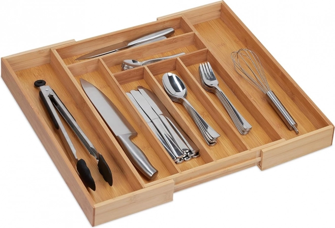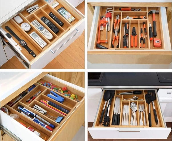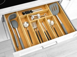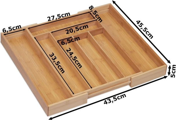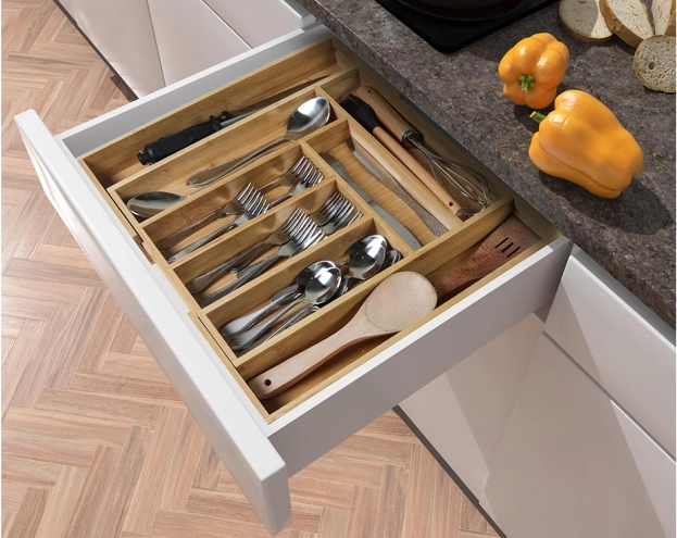 Rozszerzalne sekcje zapewniają elastyczność dla różnych szerokości szuflad, co czyni ten organizer uniwersalnym do każdej kuchni. Jego wysoka jakość wykonania gwarantuje długą żywotność i wnosi element estetyczny do każdego wnętrza.