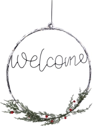 Zawieszana dekoracja w formie czarnej, metalowej, drucianej girlandy o średnicy 40 cm z napisem „WELCOME” i oświetleniem LED.