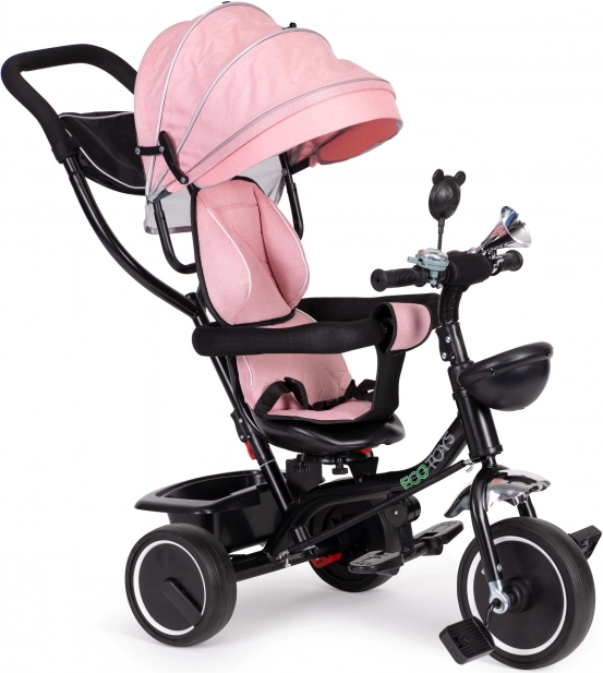 Odkryj wszechstronny trójkołowiec ECOTOYS, który rośnie razem z Twoim dzieckiem. Obrotowe siedzisko umożliwia jazdę przodem i tyłem, dzięki czemu młodsze dzieci mogą utrzymywać kontakt wzrokowy z rodzicem, a starsze cieszyć się widokiem do przodu. Miękkie oparcie, 2‑punktowe pasy oraz pałąki bezpieczeństwa zapewniają stabilność i komfort, a składany daszek chroni przed słońcem i lekkim deszczem.