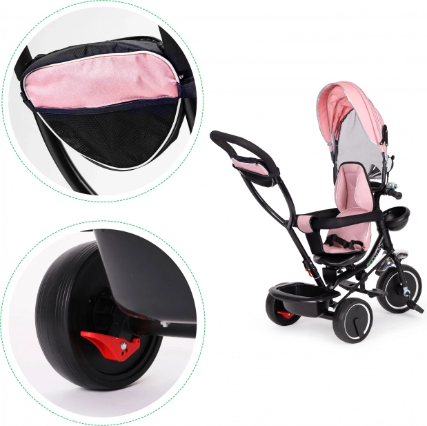 Składany daszek chroni przed słońcem, a przedni koszyk, tylny kosz i kieszeń na kierownicy pomieszczą zabawki i drobiazgi na spacer.