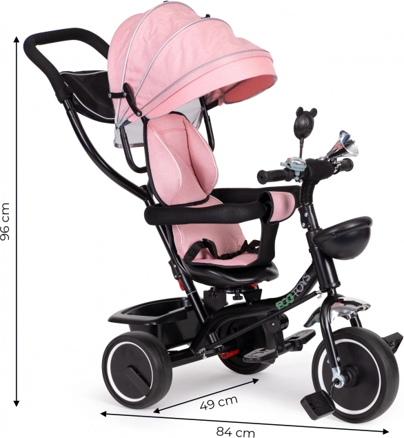 Praktyczny dziecięcy trójkołowiec ECOTOYS łączy wygodę i bezpieczeństwo na codzienne spacery. Oferuje obrotowe siedzisko 360°, składany daszek, rączkę prowadzącą z możliwością sterowania oraz stalową konstrukcję dla długiej trwałości. Dzięki pasom i pałąkom bezpieczeństwa, składanym podnóżkom oraz koszykom i kieszeniom na drobiazgi jest idealny dla dzieci od 12 miesięcy do 4 lat.