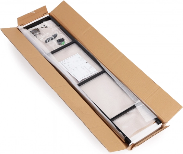 Rama z kwadratowych profili 12 mm gwarantuje wytrzymałość i stabilność, a regulowane ochronne stopki zapobiegają uszkodzeniom podłogi. W zestawie znajduje się taśma i śruby do mocowania do ściany dla większego bezpieczeństwa. Produkt jest pakowany w specjalnie wzmocnionym kartonie z wypełnieniami dla pewnej ochrony podczas transportu.
